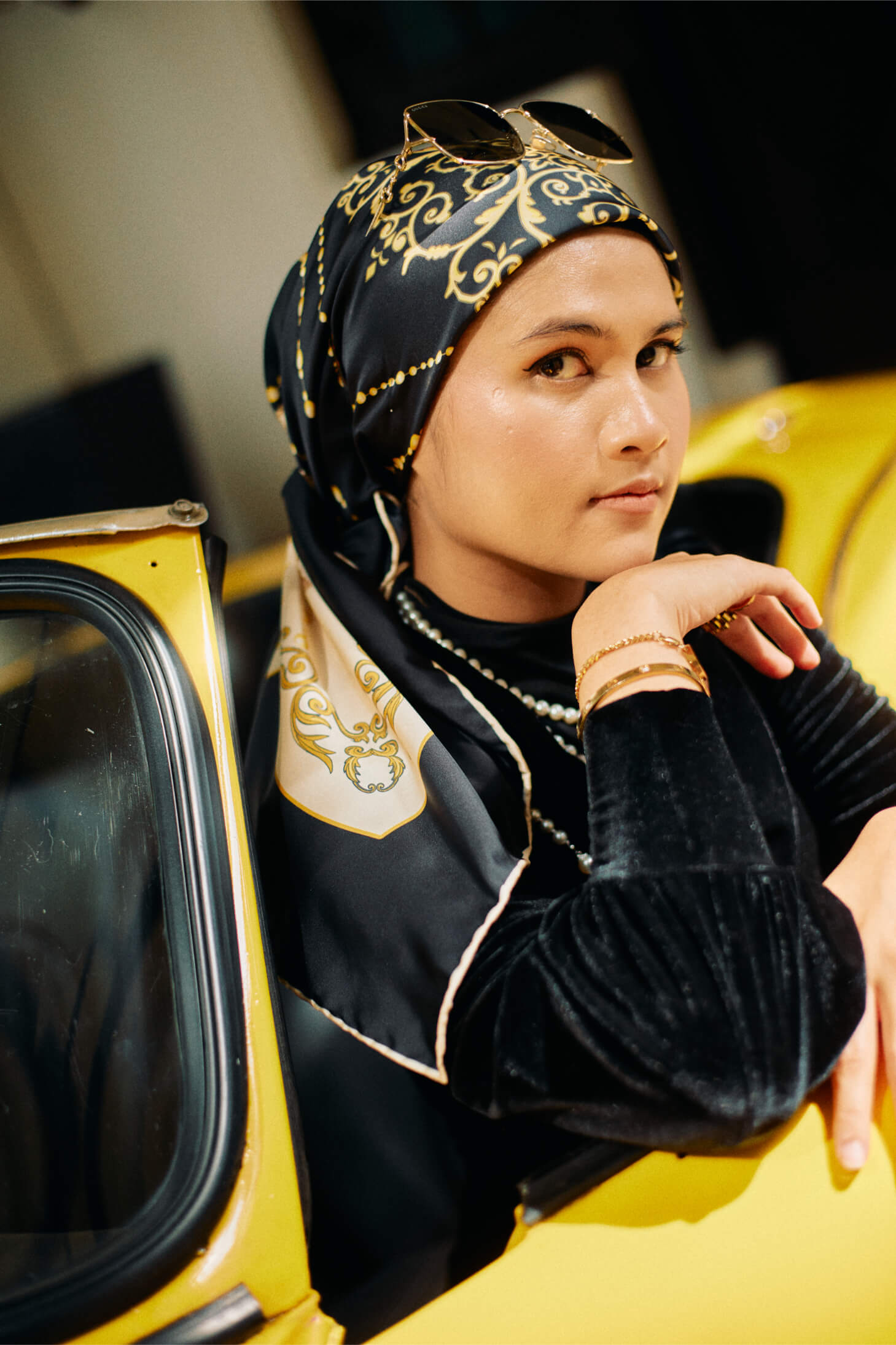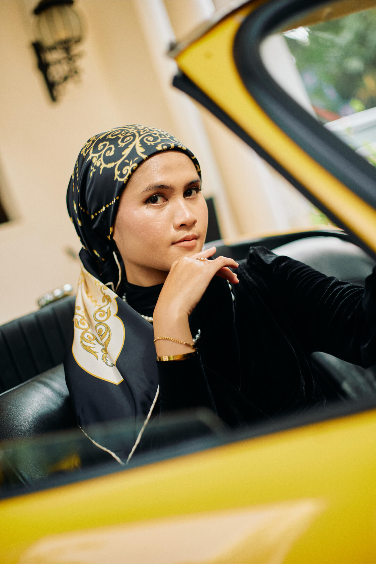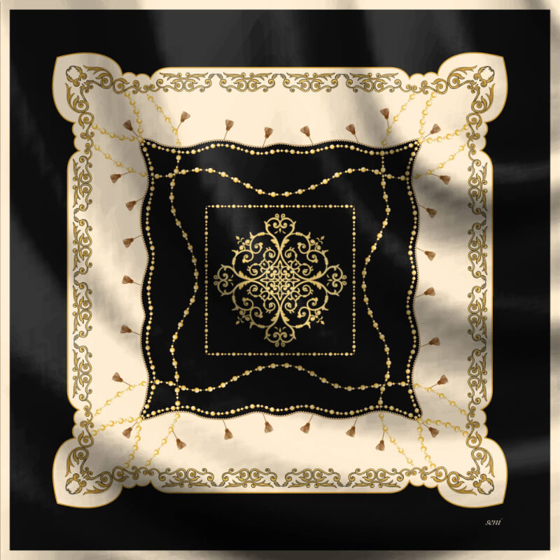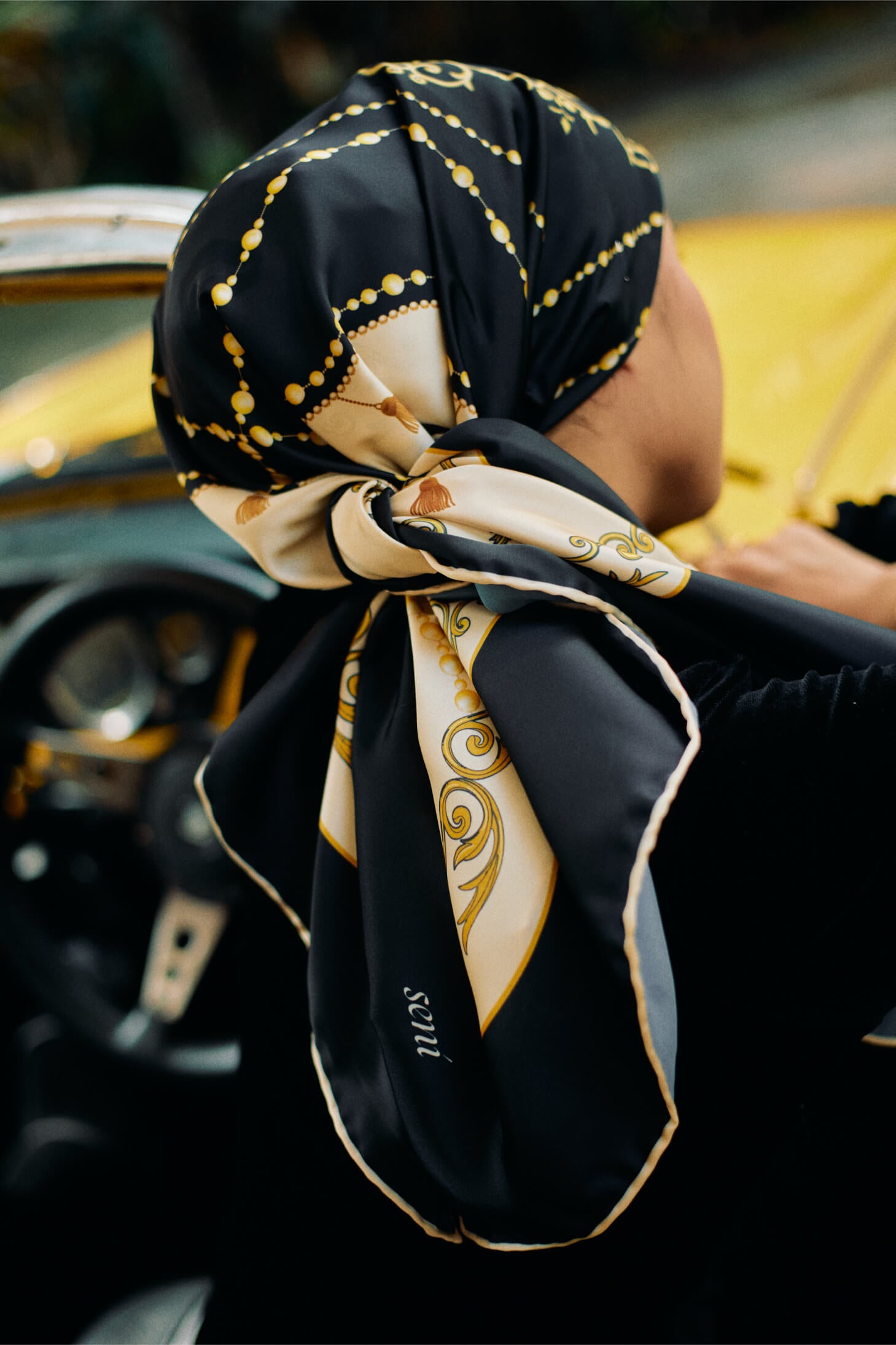 The Golden Twilight scarf is a true embodiment of luxury and timeless sophistication. Its deep, velvety black base is adorned with intricate golden accents, reminiscent of the delicate glow of twilight as day transitions to night. Made from our signature satin silk, this scarf offers a smooth, lustrous finish, elevating your look with a touch of opulence. The hand-rolled edges highlight the artisan craftsmanship, ensuring both quality and beauty in every detail. Whether styled casually or draped elegantly, Golden Twilight exudes a sense of grandeur, perfect for the woman who loves to make a bold yet refined statement.