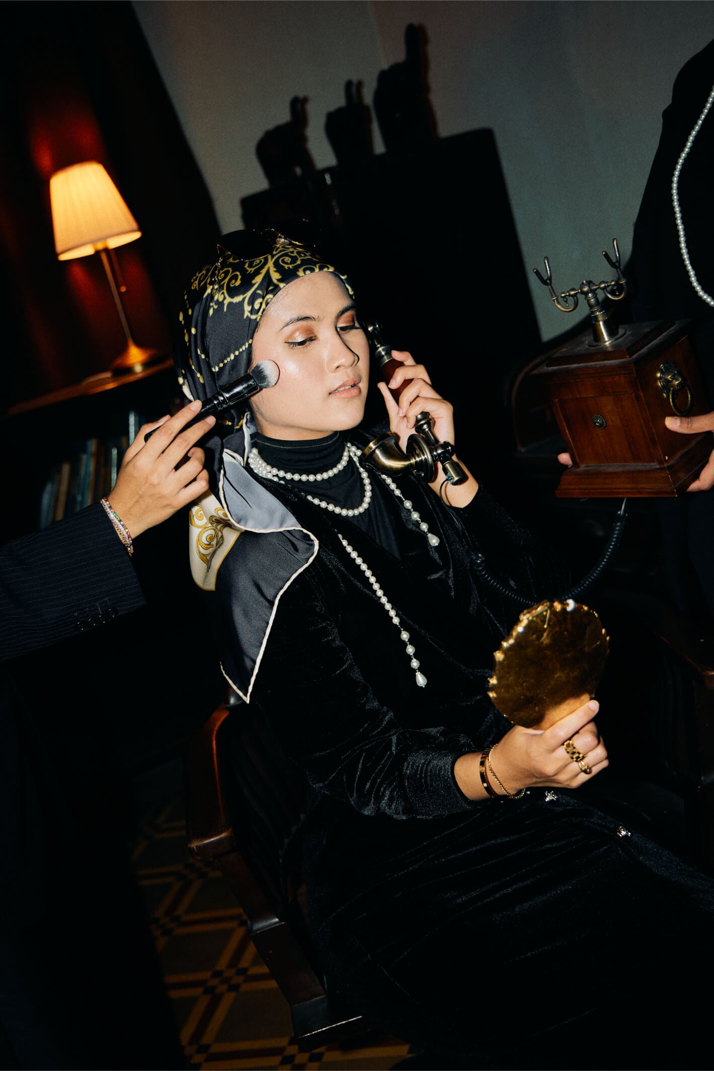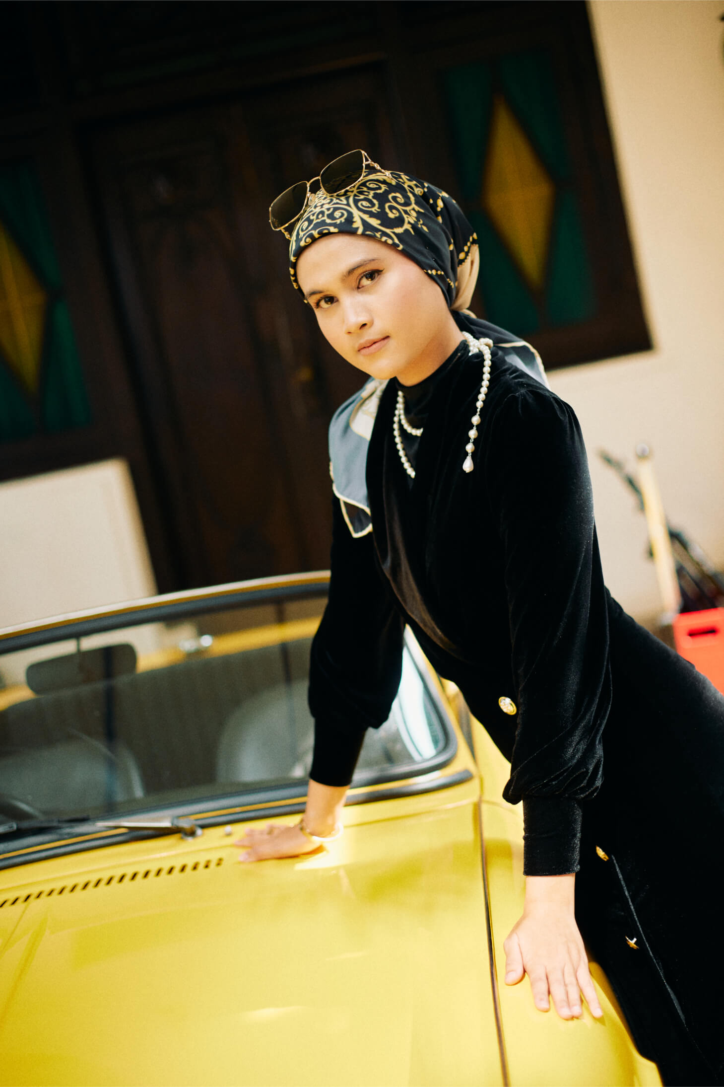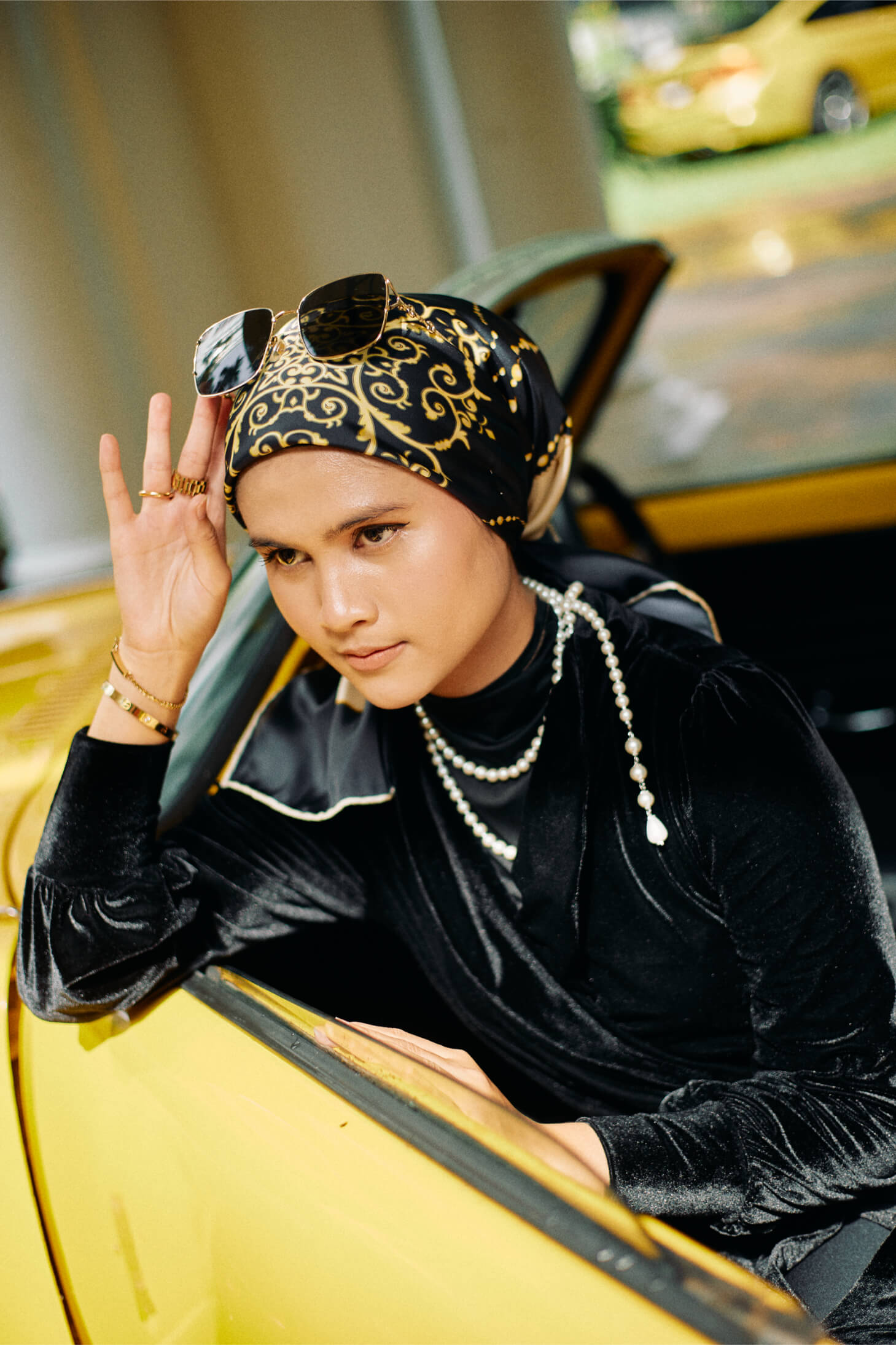 The Golden Twilight scarf is a true embodiment of luxury and timeless sophistication. Its deep, velvety black base is adorned with intricate golden accents, reminiscent of the delicate glow of twilight as day transitions to night. Made from our signature satin silk, this scarf offers a smooth, lustrous finish, elevating your look with a touch of opulence. The hand-rolled edges highlight the artisan craftsmanship, ensuring both quality and beauty in every detail. Whether styled casually or draped elegantly, Golden Twilight exudes a sense of grandeur, perfect for the woman who loves to make a bold yet refined statement.